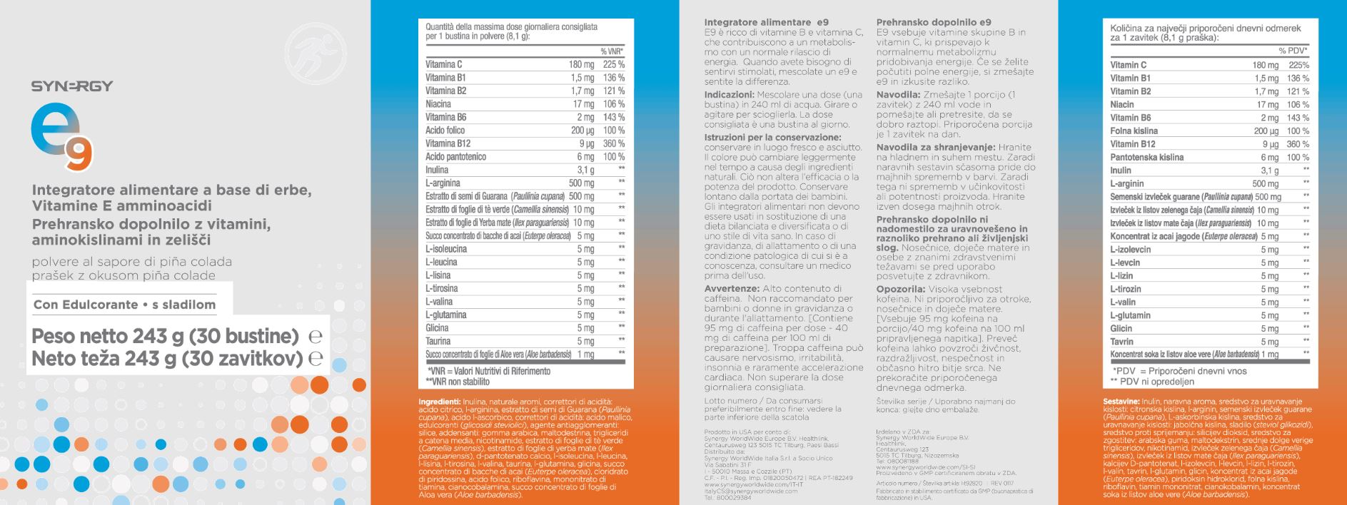 Danas postoje deseci brzih rješenja za ljude s malo energije, ali uz e9 jedinstvenu mješavinu vitamina i prirodnih izvora kofeina, možete biti sigurni da koristite proizvod koji podržava vaš zdrav način života. Ako se borite da ostanete usredotočeni, budni i puni energije bez obzira na doba dana, pripremite jednu porciju e9 i uživajte u njegovom osvježavajućem okusu Piña Colade.